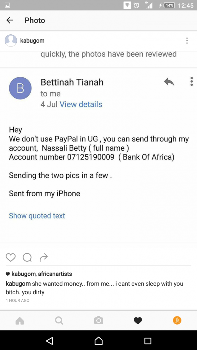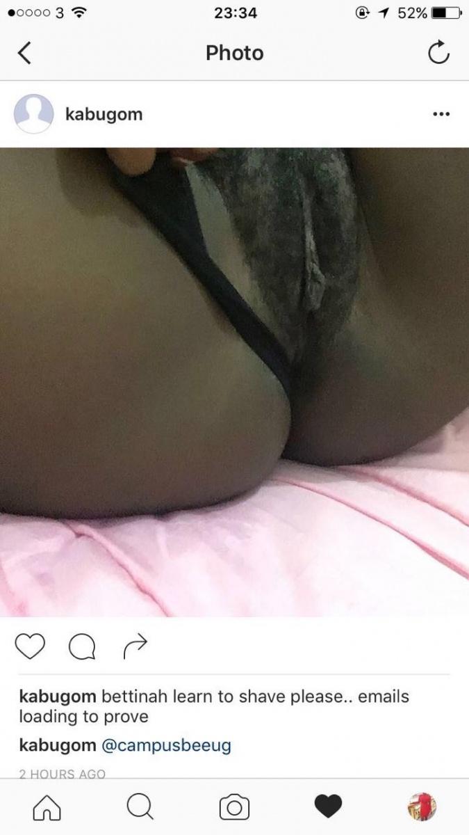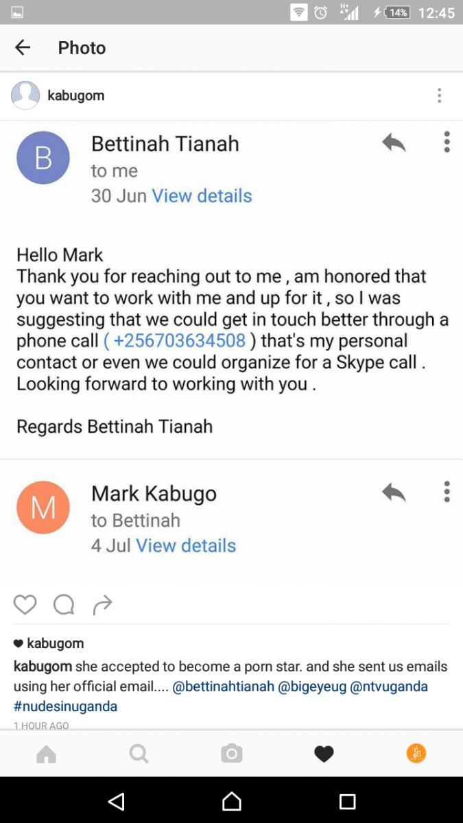 Betty Nassali a.k.a Bettinah Tianah was caught trying to charge her nudes for a mere USD500 by one Mark Kabugo. Continue watching the photos right below the link: